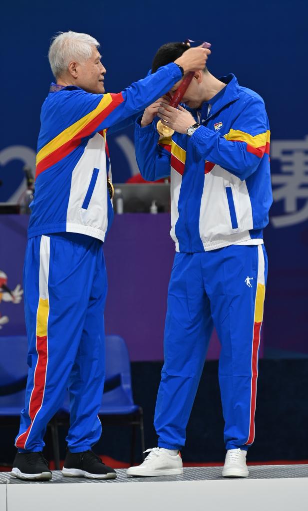 9月26日,辽宁队领队蒋兴权(左)给辽宁队主教练杨鸣佩戴金牌。