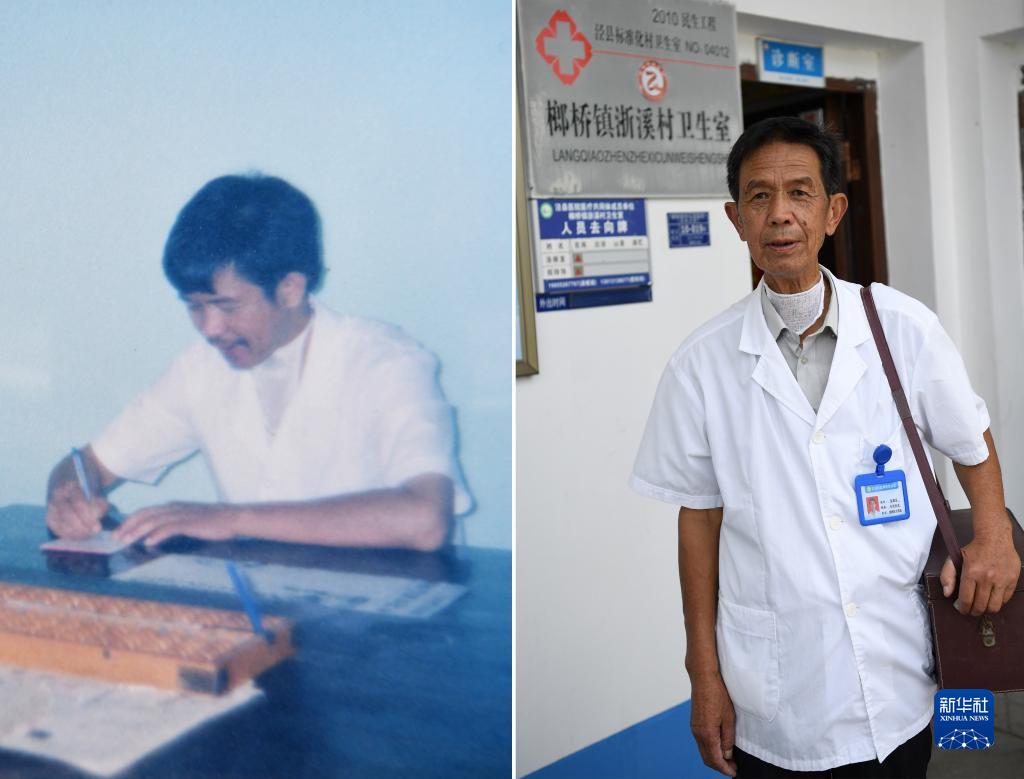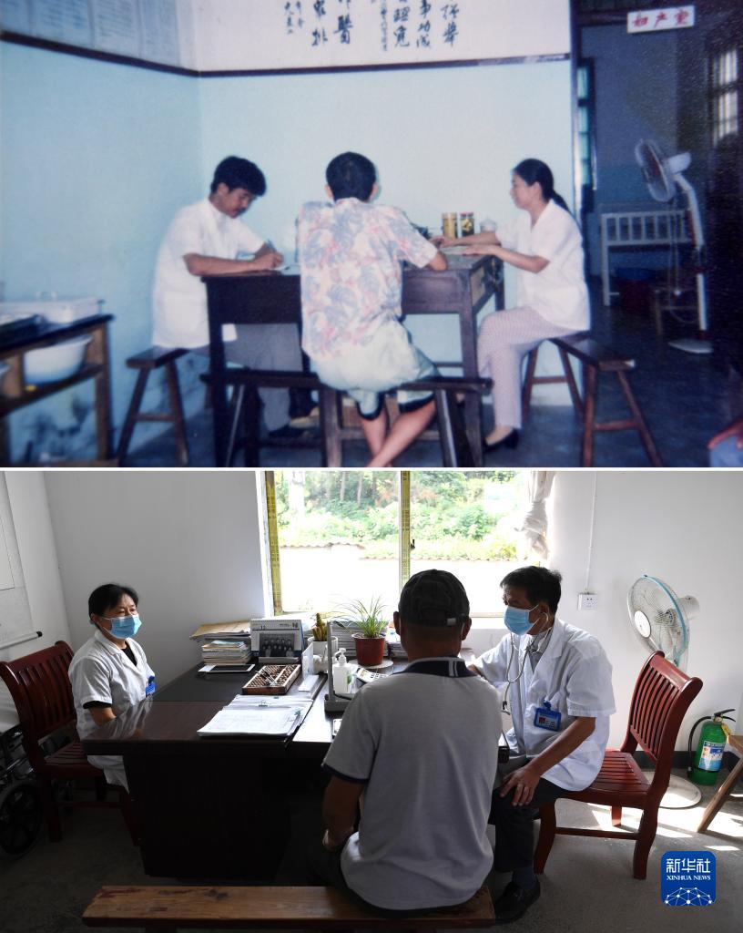 拼版照片:左图为1998年,村医汤根发在浙溪村卫生室工作(翻拍照片);右图为2021年9月24日汤根发在浙溪村卫生室。新华社记者 刘军喜 摄