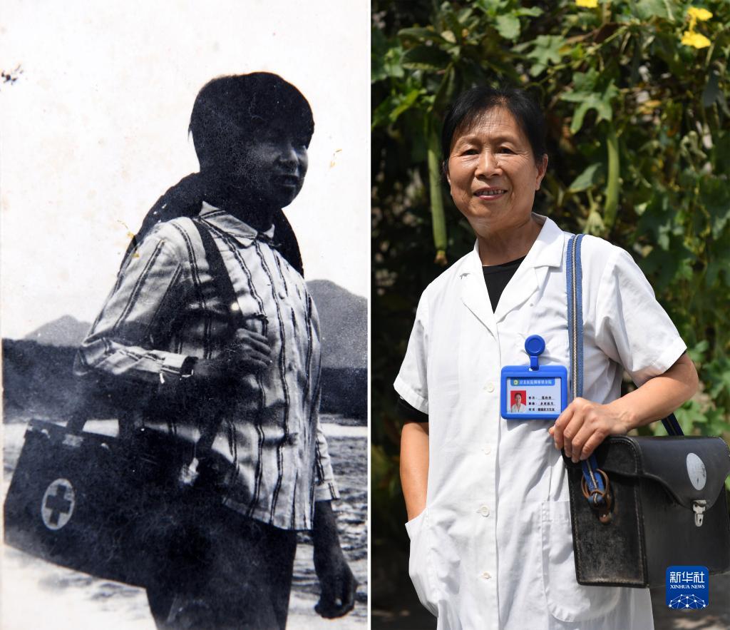 拼版照片:左图为村医郑玲玲年轻时期的工作照(翻拍照片);右图为2021年9月24日郑玲玲在浙溪村卫生室。新华社记者 刘军喜 摄