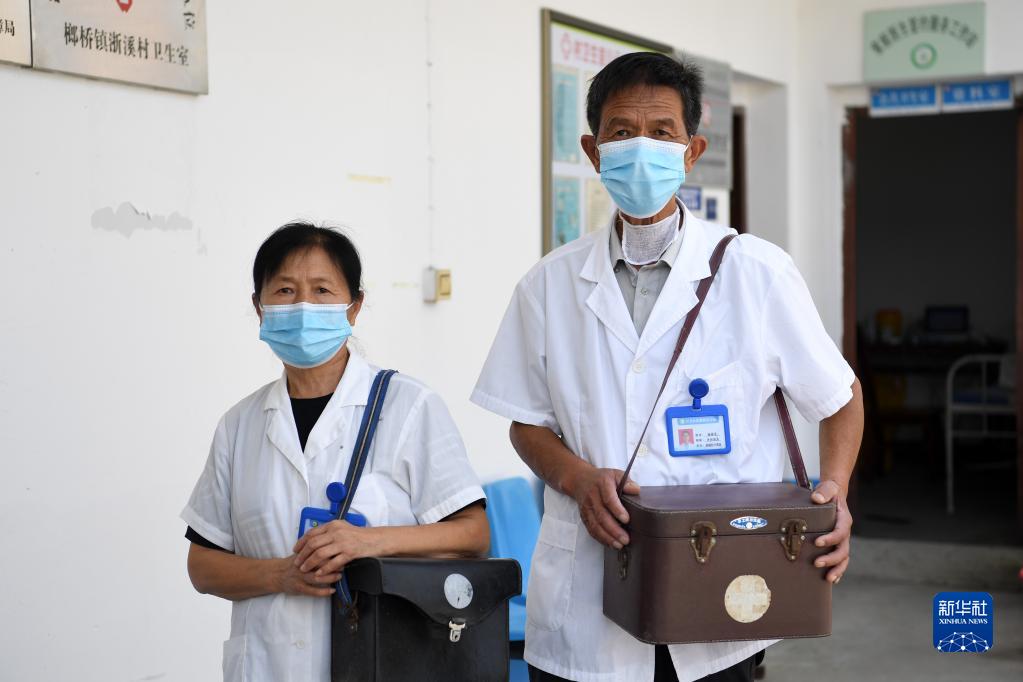 9月24日,汤根发(右)、郑玲玲在浙溪村卫生室门口,他们身边的医药箱已跟随他们数十年。新华社记者 刘军喜 摄
