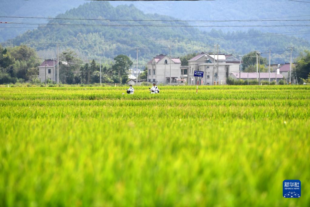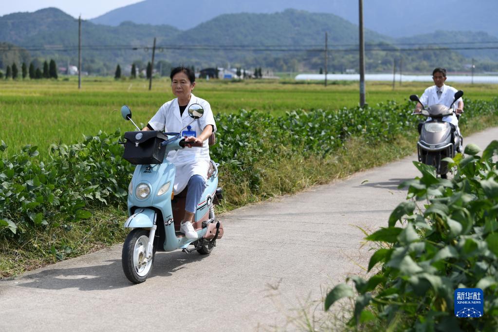 9月24日,汤根发(右)、郑玲玲骑车前往村民家开展医疗走访。新华社记者 刘军喜 摄