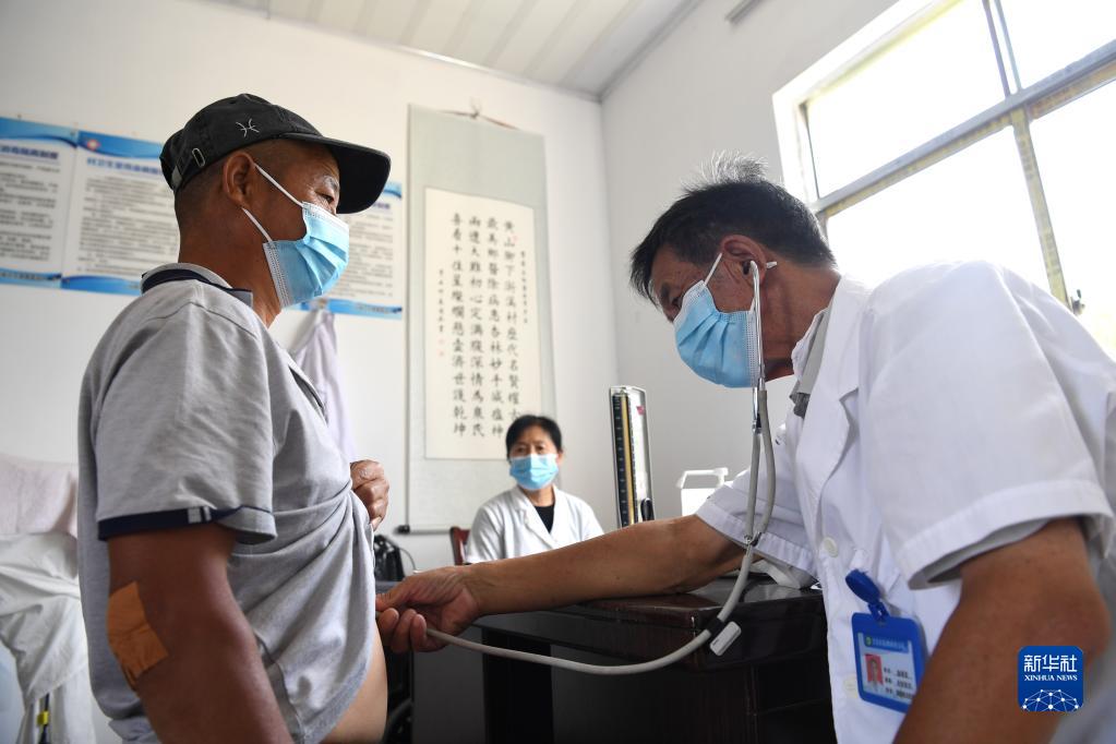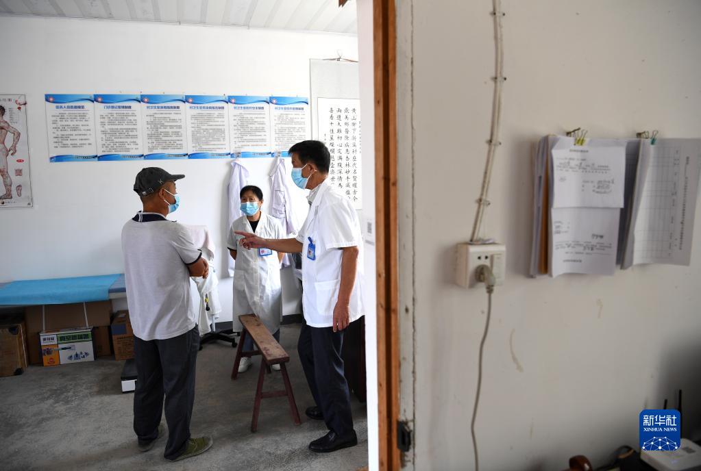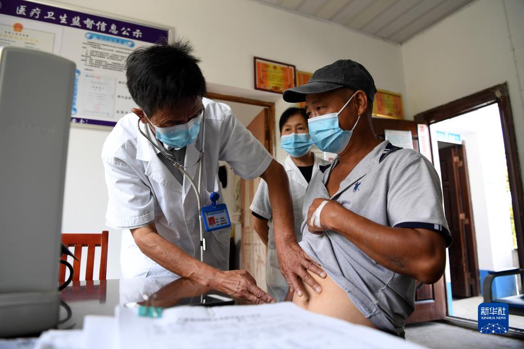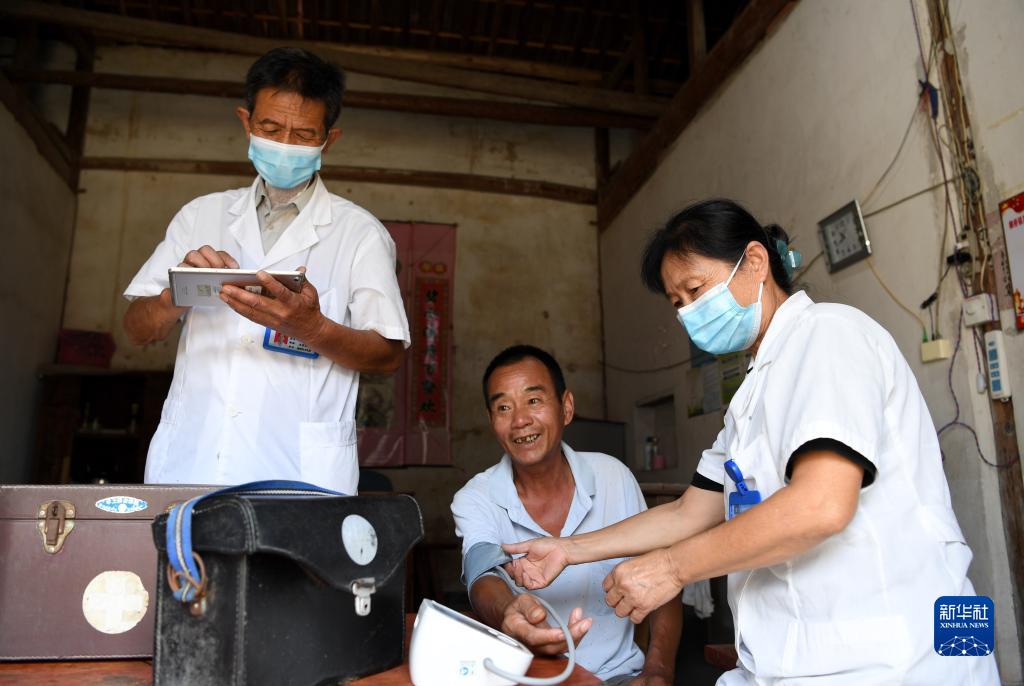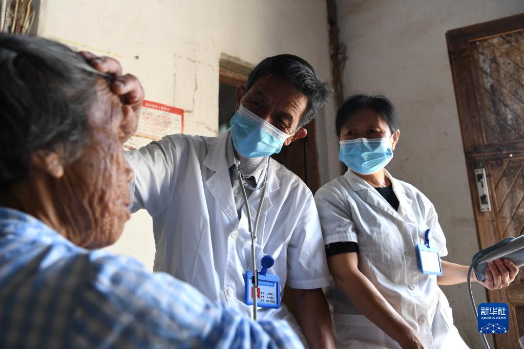 9月24日,汤根发(中)、郑玲玲在村民家开展医疗走访。新华社记者 刘军喜 摄