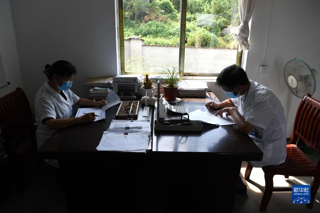 9月24日,汤根发(右)、郑玲玲在浙溪村卫生室办公。新华社记者 刘军喜 摄