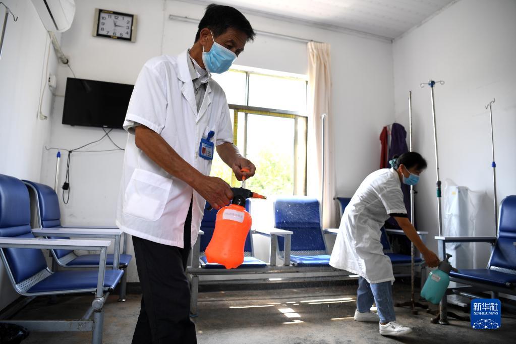 9月24日,汤根发(左)、郑玲玲在浙溪村卫生室消毒。新华社记者 刘军喜 摄