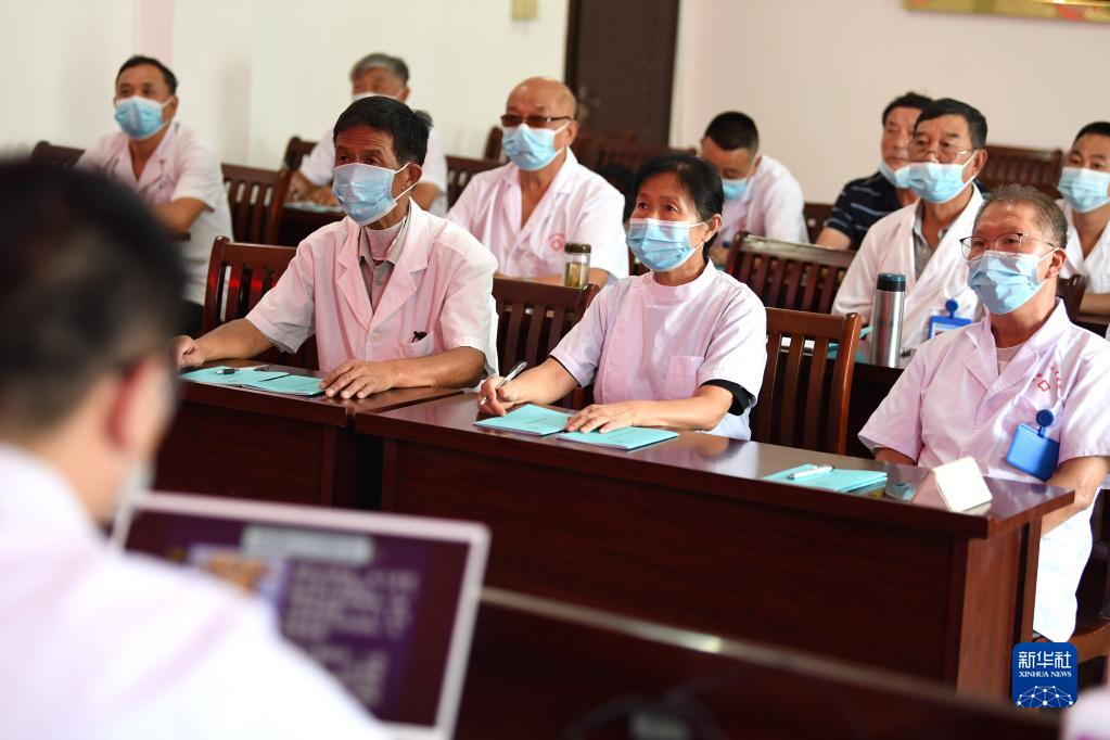 9月24日,汤根发(前右三)、郑玲玲(前右二)在榔桥镇中心卫生院参加乡村医生培训 。新华社记者 刘军喜 摄