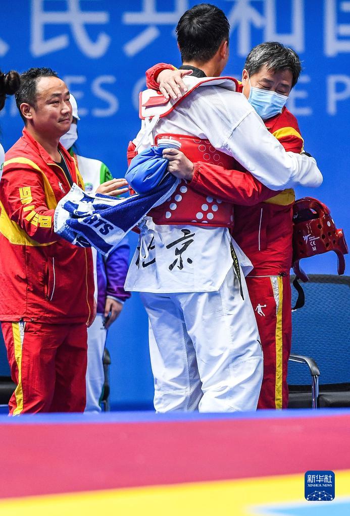 9月26日,北京队选手宋兆祥赛后和教练拥抱庆祝。