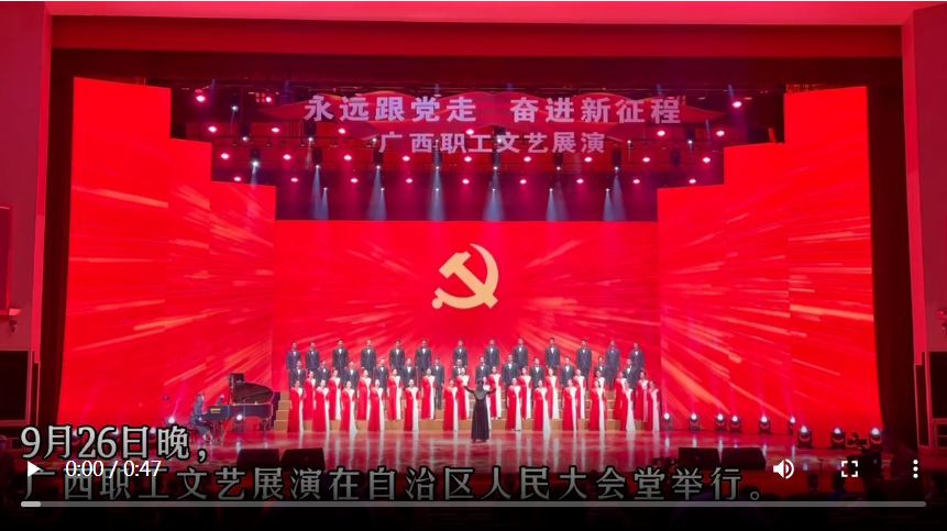 由广西壮族自治区总工会主办、广西卫视承制的“永远跟党走奋进新征程”广西职工文艺展演,于9月26日晚在广西人民会堂上演。广西壮族自治区人大常委会副主任、党组副书记,自治区总工会主席张晓钦,自治区人大常委会副主任、党组成员赵乐秦,与全区的全国、广西劳动模范和先进工作者代表,全国、广西五一劳动奖章获得者代表、广西工匠代表、从事工会工作30年以上的工会干部代表以及驻南宁一线职工代表一同观看演出。