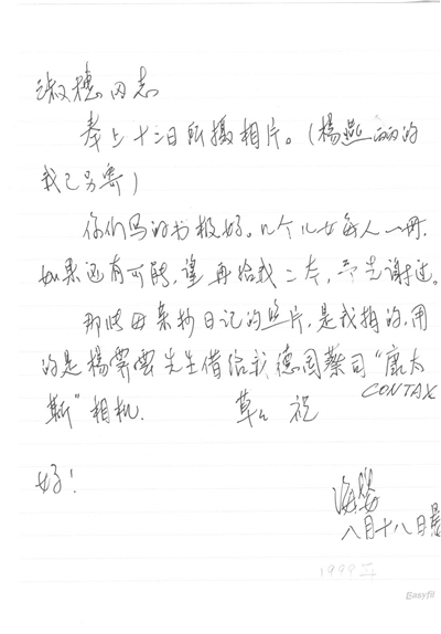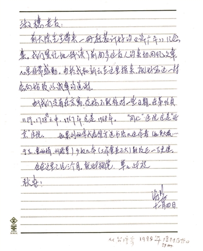 还有关于鲁迅的棺木到底是谁买的等等,诸如此类的问题,海婴同志都一一考证,求得史实的准确。再如为弄清“文化大革命”中鲁迅手稿遭遇的真相,他曾到监狱去找戚本禹,也曾访问过原北京卫戍区司令傅崇碧同志等等。他也曾非常仔细地多次纠正我写的稿件中史实的不准确,如1995年我在纪念许广平先生的《许广平》一书中写了一篇《难忘的恩泽 永远的怀念》,海婴同志在台湾看到这篇文章中的错误,特意写信给予纠正,信中写道:“由于我们没有在京寓,使妳不能核对一些日期,在第96页11行、17、18行之中,1967应是1968,‘同仁’医院应是‘北京’医院”(见海婴信1)等等,对于这些不准确的提法,他都从不放过。