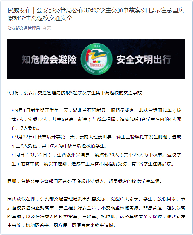 中工网讯 据公安部交通管理局官方微信公众号消息,9月份,公安部交通管理局接报3起涉及学生集中离返校的交通事故: