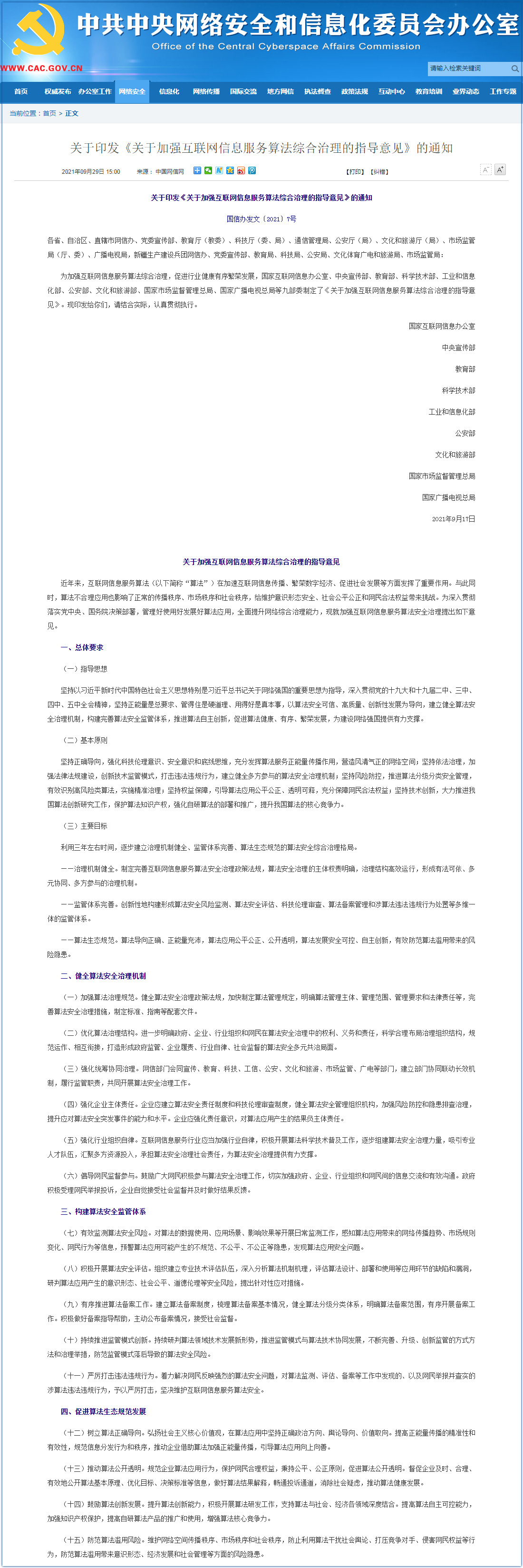 近年来,互联网信息服务算法(以下简称“算法”)在加速互联网信息传播、繁荣数字经济、促进社会发展等方面发挥了重要作用。与此同时,算法不合理应用也影响了正常的传播秩序、市场秩序和社会秩序,给维护意识形态安全、社会公平公正和网民合法权益带来挑战。为深入贯彻落实党中央、国务院决策部署,管理好使用好发展好算法应用,全面提升网络综合治理能力,现就加强互联网信息服务算法安全治理提出如下意见。