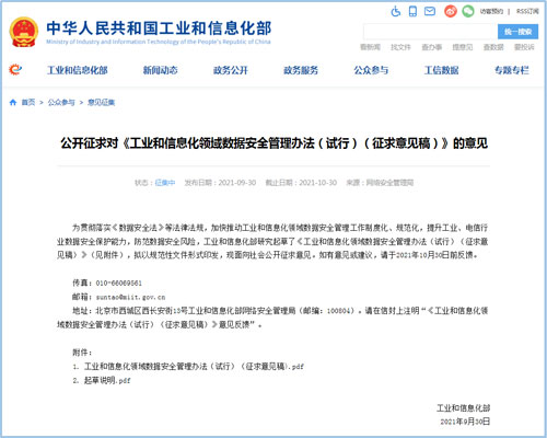 中工网讯 据工信部网站消息,9月30日,工信部发布《公开征求对<工业和信息化领域数据安全管理办法(试行)(征求意见稿)>的意见》。为贯彻落实《数据安全法》等法律法规,加快推动工业和信息化领域数据安全管理工作制度化、规范化,提升工业、电信行业数据安全保护能力,防范数据安全风险,工业和信息化部研究起草了《工业和信息化领域数据安全管理办法(试行)(征求意见稿)》,拟以规范性文件形式印发,2021年10月30日前面向社会公开征求意见。