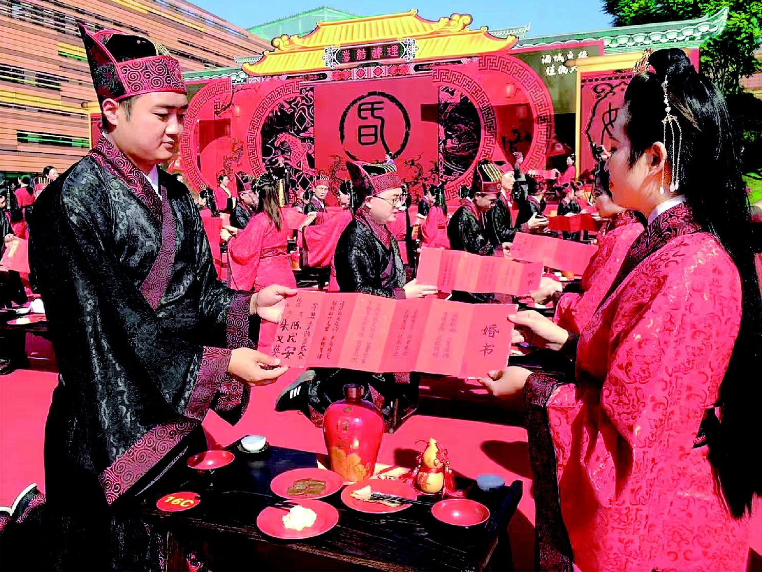 婚礼现场,50对新人身着汉服,伴随着浪漫而喜庆的乐曲,走上红毯,大屏幕同时播放出每对新人的一组“结缘”短片,展现新人相知相恋的美好瞬间和爱的誓言。此次集体婚礼同时通过网上直播,吸引了80多万人次围观。4万多条留言表达了对新人的祝福,同时也称赞此次集体婚礼“隆重庄严、华而不俗、喜而不闹,示范引领社会公众树立文明的爱情观、婚姻观,展示了酒城文明新风尚。”