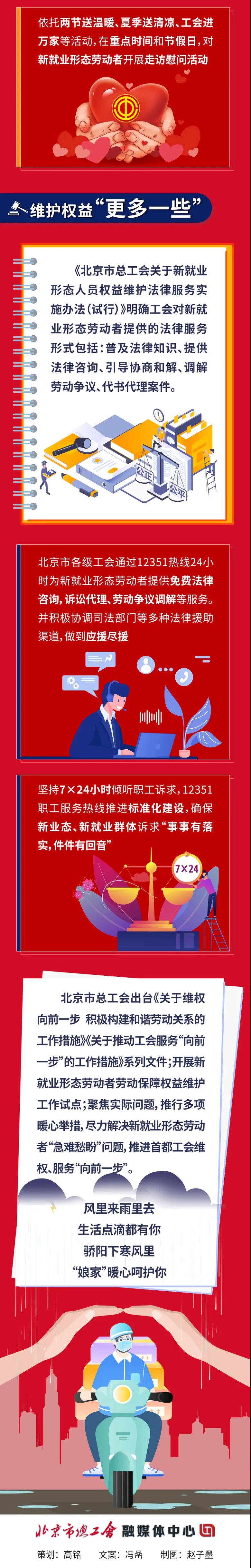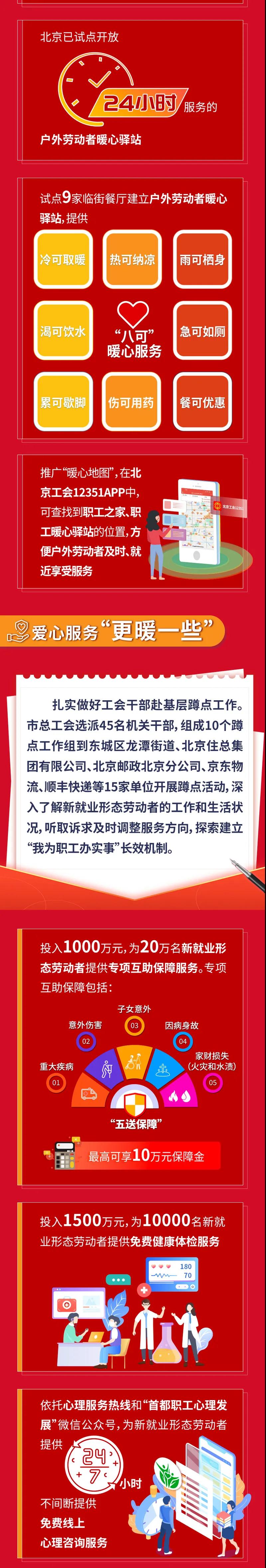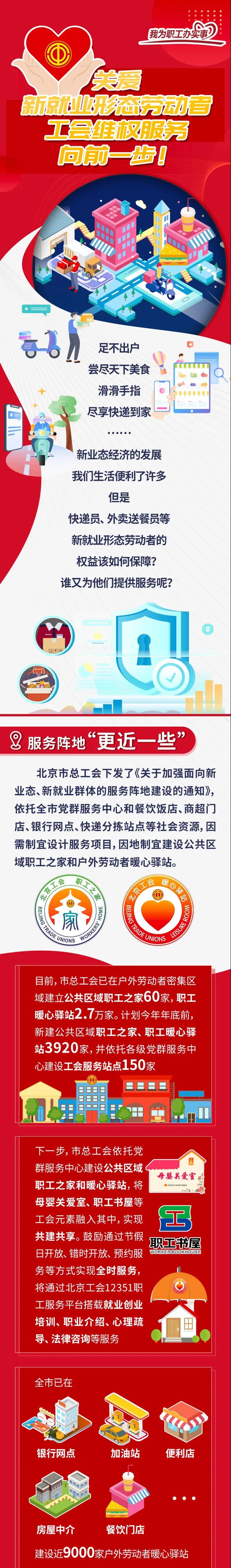 中工网讯 据北京市总工会微信公众号“暖微工会”消息,近日,北京市总工会下发了《关于加强面向新业态、新就业群体的服务阵地建设的通知》,依托全市党群服务中心和餐饮饭店、商超门店、银行网点、快递分拣站点等社会资源,因需制宜设计服务项目,因地制宜建设公共区域职工之家和户外劳动者暖心驿站。