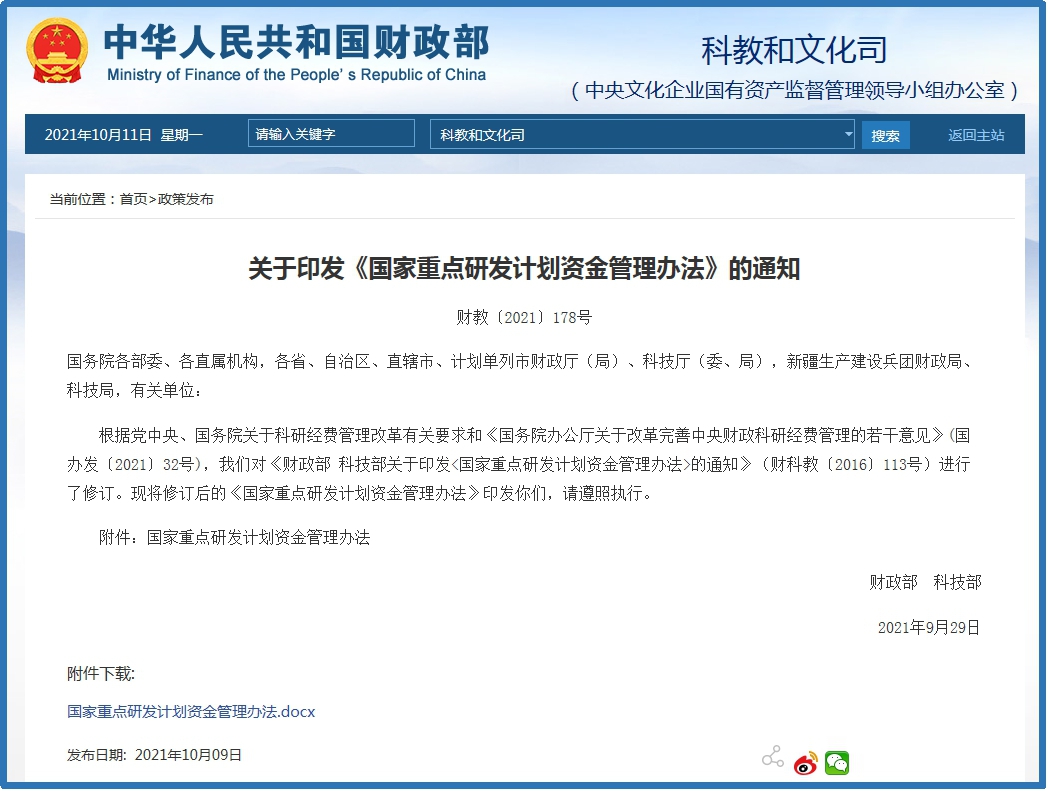 据财政部网站消息,根据党中央、国务院关于科研经费管理改革有关要求和《国务院办公厅关于改革完善中央财政科研经费管理的若干意见》(国办发〔2021〕32号),财政部、科技部对《财政部 科技部关于印发<国家重点研发计划资金管理办法>的通知》(财科教〔2016〕113号)进行了修订。