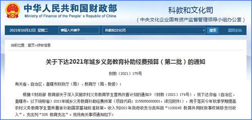 中工网讯 据财政部官网消息,10月12日,财政部发布2021年城乡义务教育补助经费预算(第二批)的通知。通知如下: