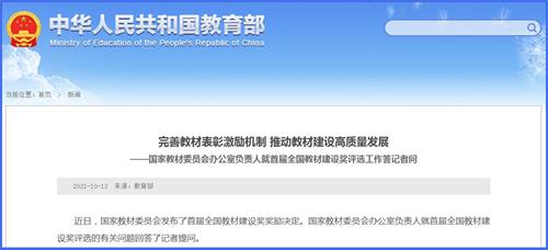 中工网讯 据教育部官网消息,10月12日,国家教材委员会印发《关于首届全国教材建设奖奖励的决定》,国家教材委员会办公室负责人就首届全国教材建设奖评选的有关问题回答了记者提问。