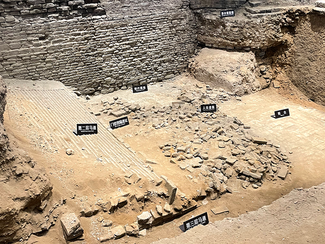 考古发掘,先后发现了年代不同的三层马道上下相叠,传说中的开封“城摞城”,就从这里得到了实物验证。图为古马道遗址。