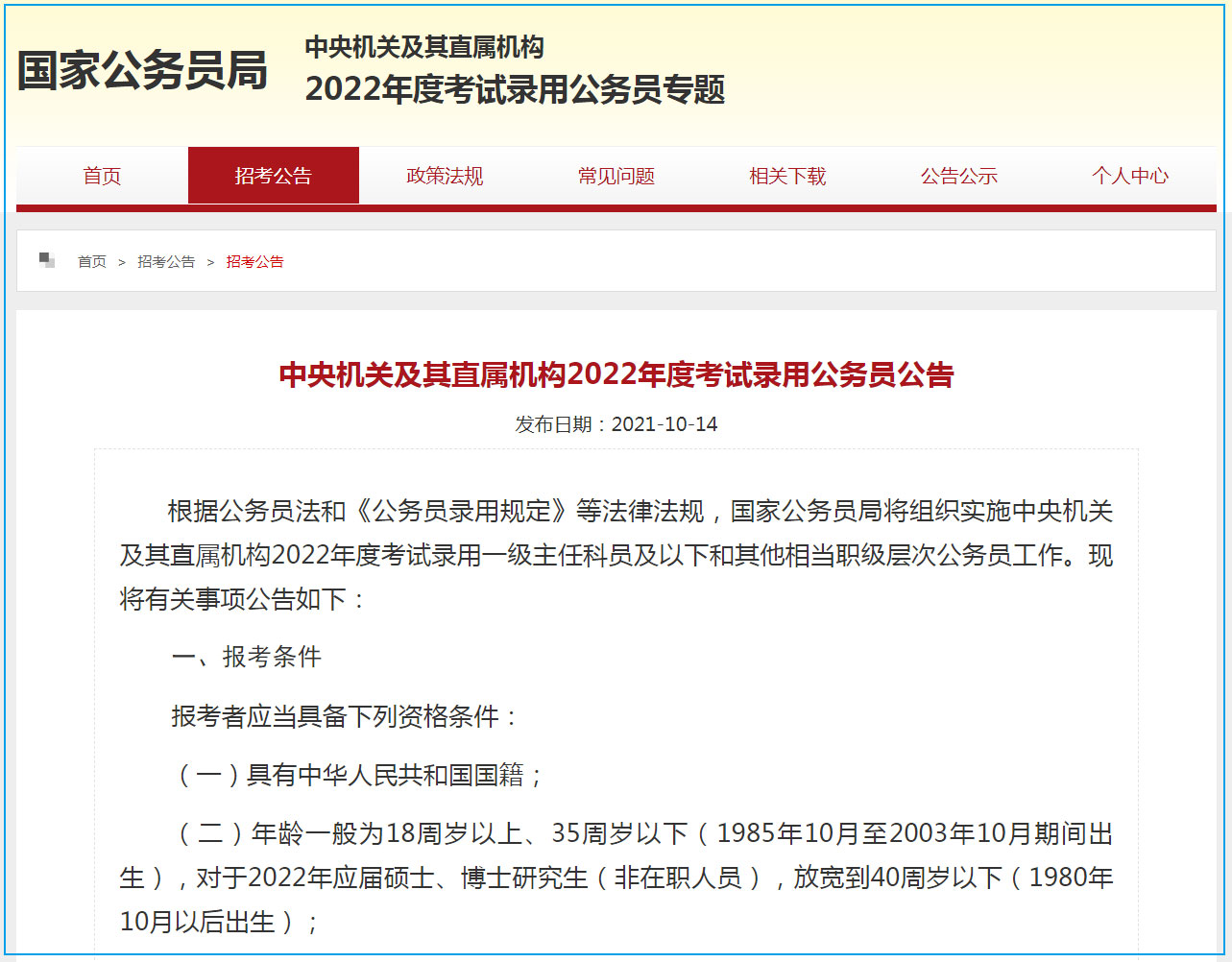 (二)年龄一般为18周岁以上、35周岁以下(1985年10月至2003年10月期间出生),对于2022年应届硕士、博士研究生(非在职人员),放宽到40周岁以下(1980年10月以后出生);