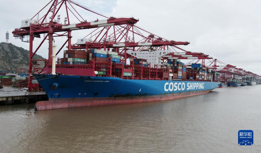 10月13日,中远海运“天秤座”轮停泊在上海洋山港二期码头(无人机照片)。