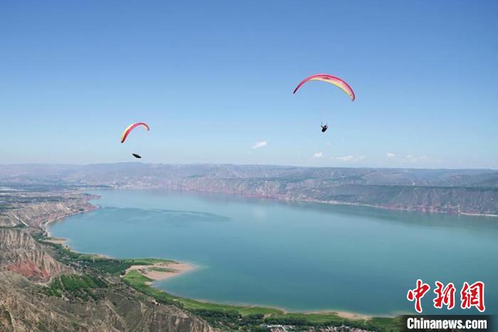 图为滑翔伞运动员在甘肃刘家峡水库上空竞技。 (资料图) 艾庆龙 摄
