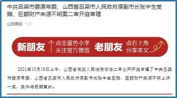 据山西高院微信公众号消息,2021年10月19日上午,山西省高级人民法院依法二审公开开庭审理了中共吕梁市委原常委、山西省吕梁市人民政府原副市长张中生受贿、巨额财产来源不明上诉一案,案件将择期宣判。
