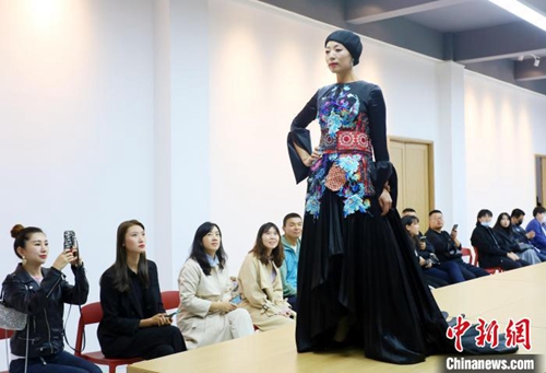 2021年9月,东乡绣娘身着带有“东乡刺绣”元素的民族服饰练习在T台走秀。(资料图) 高展 摄