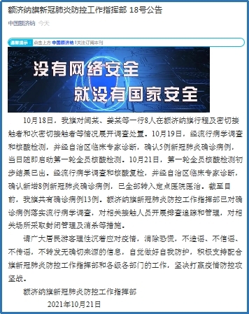 中工网讯 据“中国额济纳”微信公众号消息,10月18日,中国额济纳对闫某、姜某等一行8人在额济纳旗行程及密切接触者和次密切接触者等情况展开调查处置。10月19日,经流行病学调查和核酸检测,并经自治区临床专家诊断,确认5例新冠肺炎确诊病例,当日随即启动第一轮全员核酸检测。10月21日,第一轮全员核酸检测初步结果已出。经流行病学调查和核酸复检,并经自治区临床专家诊断,确认新增8例新冠肺炎确诊病例,已全部转入定点医院医治。截至目前,中国额济纳共有确诊病例13例。额济纳旗新冠肺炎防控工作指挥部已对确诊病例落实流行病学调查,对相关接触人员开展排查追踪和管理,对相关场所采取封闭管理及消杀等措施。