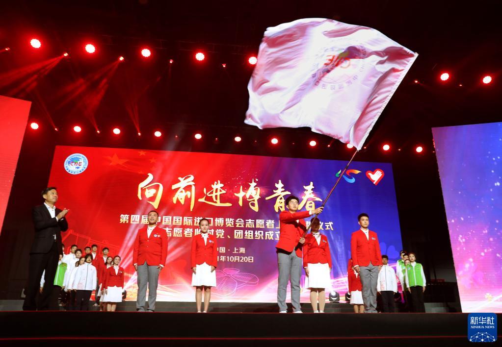 10月20日,志愿者代表在仪式现场挥舞第四届进博会志愿者总队队旗。