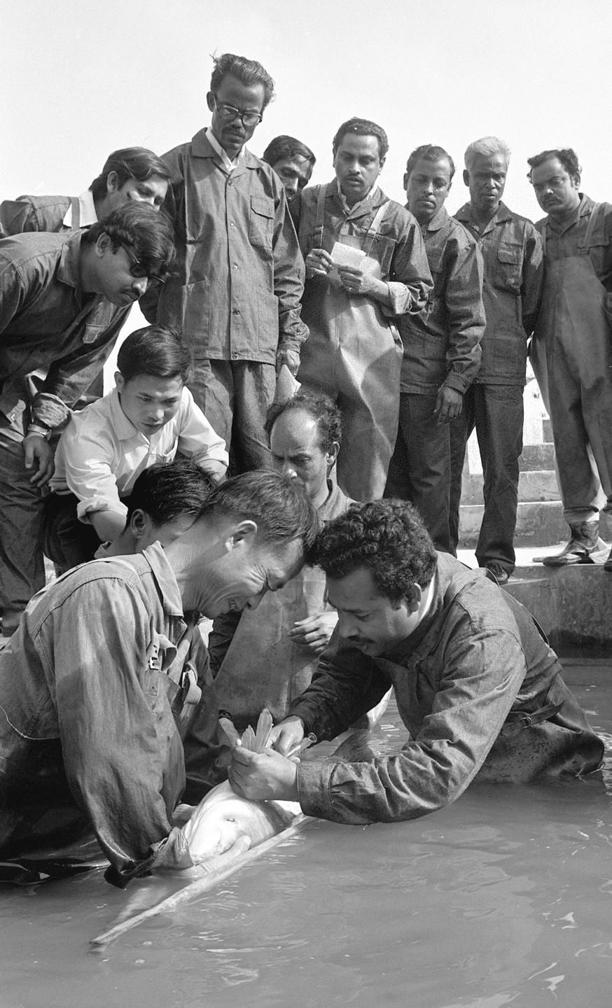 1978年5月,中国为联合国开发计划署和联合国粮食及农业组织举办淡水养鱼培训班,学员在广州学习给雌鱼注射药液。新华社记者陈学思摄