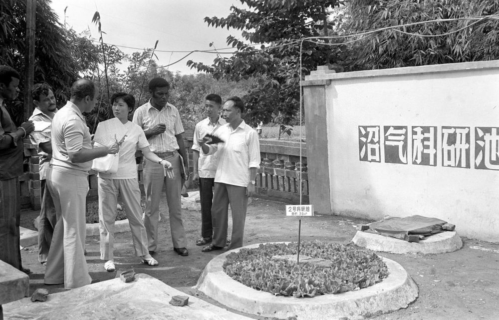 1979年7月至8月,联合国环境规划署和中国国务院环境保护办公室在中国成都等地举办了为期近一月的沼气建设讲习班。参加讲习班的亚、非和拉丁美洲的18个国家的学员参观四川绵阳市农村的一个沼气池。新华社记者金勖琪摄