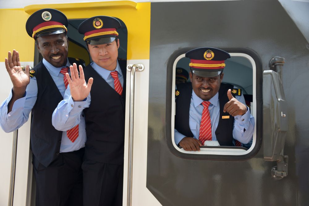 ↑ 2016年10月1日,在埃塞俄比亚首都亚的斯亚贝巴拉布车站,中方和埃塞俄比亚列车司机向参观者挥手致意。埃塞俄比亚首都亚的斯亚贝巴至吉布提铁路(亚吉铁路)是中国企业在海外首次采用全套中国标准和中国装备建造的第一条现代电气化铁路,全长751.7公里,设计时速120公里,总投资约40亿美元。新华社记者孙瑞博摄