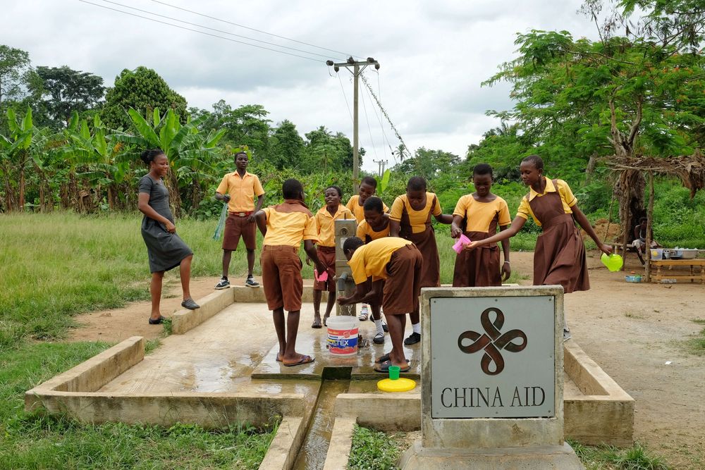 2018年6月18日,在加纳东部省古阿由兹村,学生从中国援建的水井打水。新华社记者赵姝婷摄