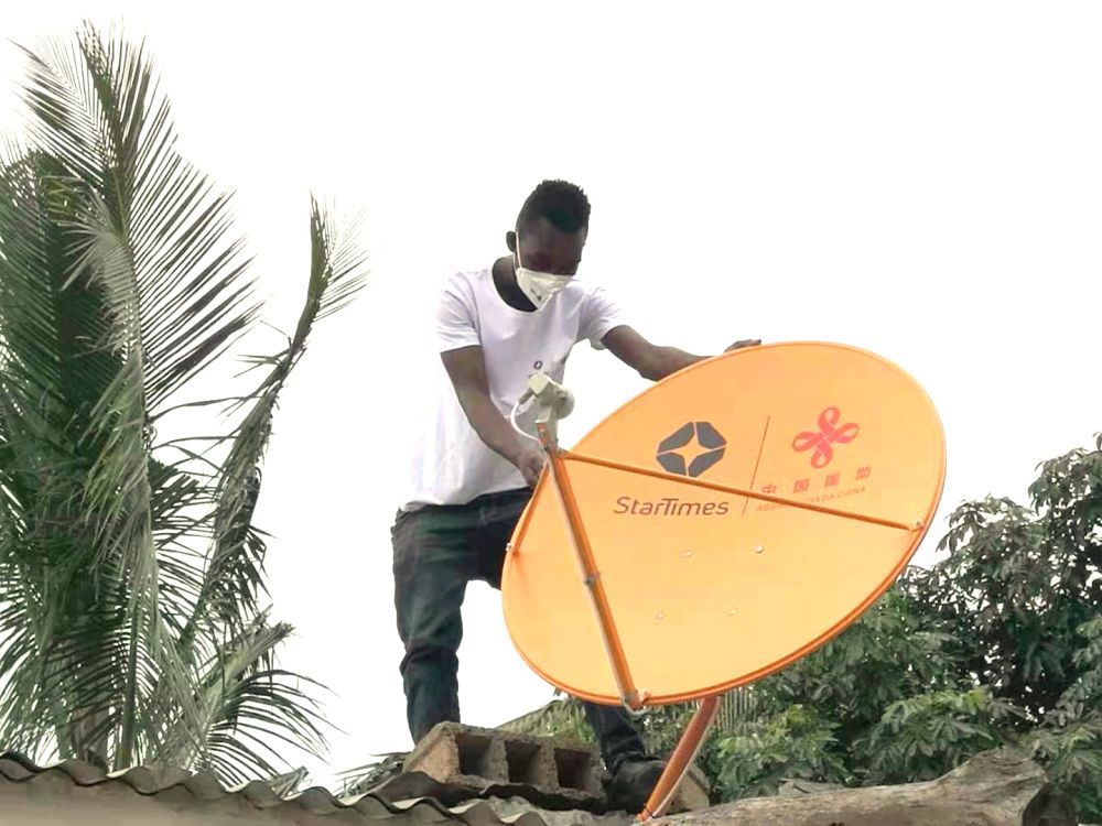 ↑ 2019年9月,在莫桑比克马普托省一个村落,中国援建莫桑比克“万村通”项目为当地居民安装卫星电视设备。新华社发