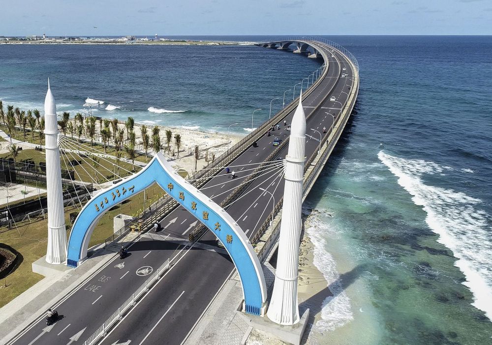 这是2019年9月1日拍摄的马尔代夫中马友谊大桥(无人机拍摄)。中马友谊大桥是马尔代夫历史上首座跨海大桥,结束了从首都马累与新兴城市、第二大岛胡鲁马累之间只能通过轮渡往来的历史。新华社发(王明亮摄)