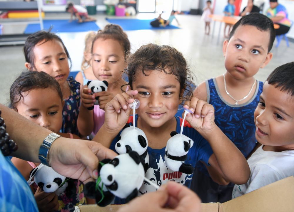 2019年10月26日,在库克群岛首都阿瓦鲁阿,中国援建的阿皮尼考学校中的孩子手拿来自中国的熊猫挂件。新华社记者郭磊摄