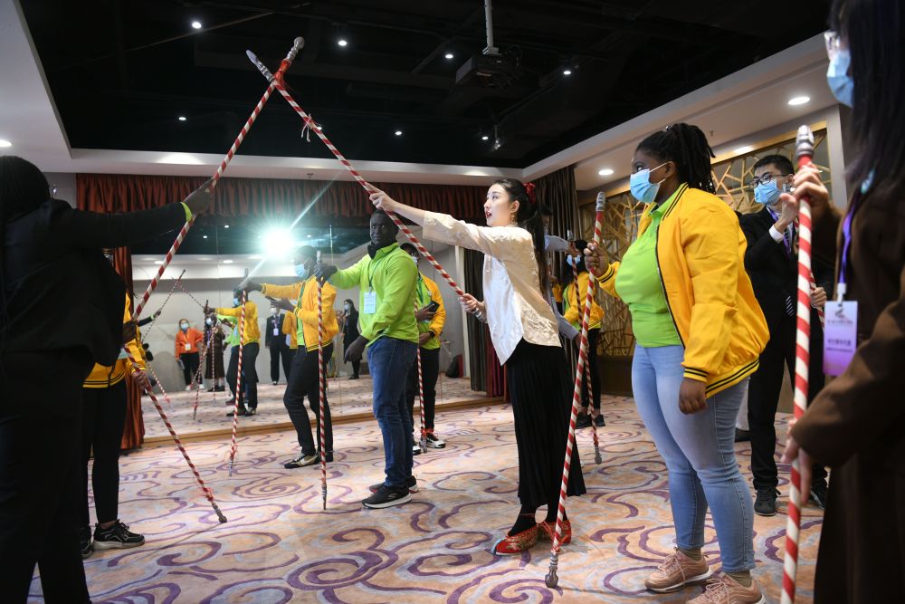 2021年10月19日,参加第六届中非青年大联欢的青年在北京中国宋庆龄青少年科技文化交流中心参加京剧、中医、雅乐、刺绣、印染等中国传统文化体验活动。新华社记者 金良快 摄