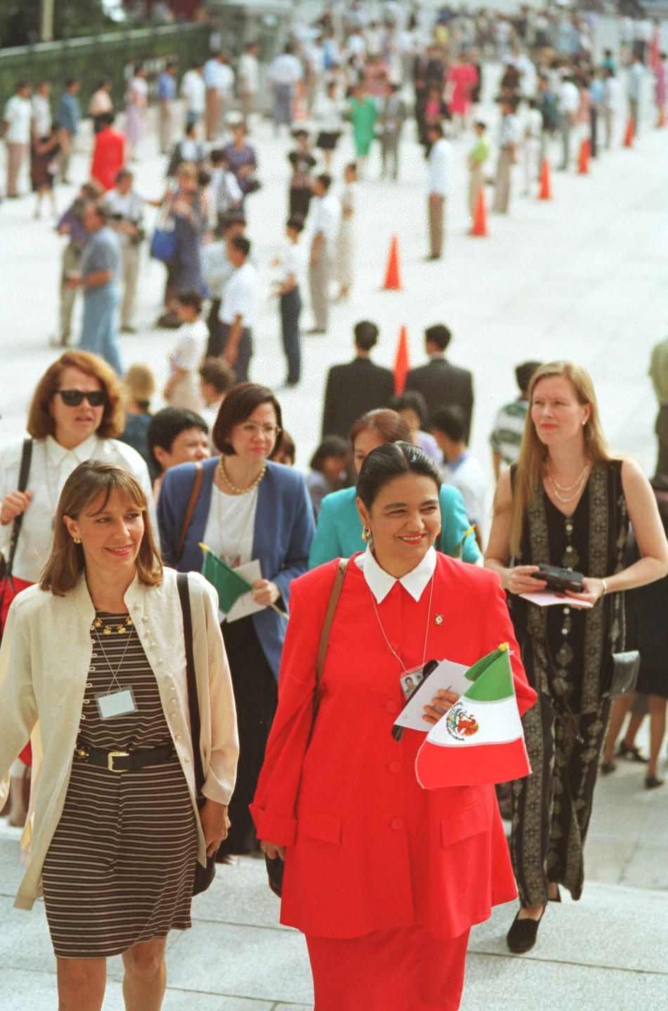 1995年9月4日,各国妇女在北京人民大会堂参加联合国第四次世界妇女大会欢迎仪式。新华社记者张旭摄