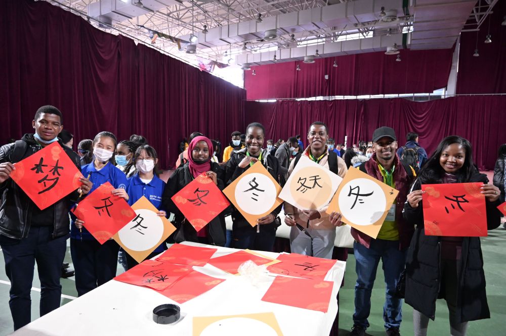 2021年10月21日,在北京中非青年大联欢活动中,非洲青年在八达岭国际会展中心写毛笔字。新华社发