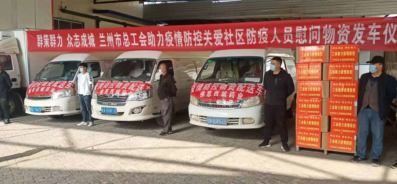 兰州市总工会筹集资金200多万元投入疫情防控工作,先后慰问了兰州方舱实验室、兰州市疾控中心、兰州市卫生监督所等抗疫一线单位医护人员和职工,为他们送去慰问金和慰问物资。10月28日,举行“群策群力、众志成城,兰州市总工会助力疫情防控关爱社区防疫人员慰问物资发车仪式”,为全市405个社区一线工作者配送90多万元的消毒凝胶、口罩、防护面罩等防疫物资。兰州市总工会还将采用多种方式对兰州肺科医院、兰州市第二人民医院雁滩分院医护工作者及家属进行慰问。