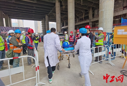 此外,现场举行了触电应急演练,项目部邀请紫荆医院外科主任张杰,护士长余晶京为大家传授应急演练知识。张主任为现场的管理人员和工友们讲解了创伤急救基本技术,余晶京为大家现场演示了自动体外除颤仪(AED)的使用方法,讲解了心肺复苏的救护流程等急救常识,并在现场模拟示范了工人触电之后应该如何正确处理。