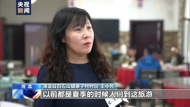 河北省涞源县白石山镇寨子村村民 王小芳:以前都是夏季人们到这旅游,现在游客春天的时候到这赏花,然后夏天的时候来这避暑,秋天的时候来这采摘,冬天的时候到这滑雪,基本上一年四季都能吃上旅游饭,收入也能达到20多万,比以前翻了好几倍,觉得挺好,挺开心。