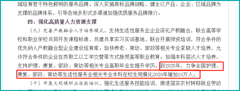 日前,国家发改委《关于推动生活性服务业补短板上水平提高人民生活品质若干意见》提到:加快养老、育幼、家政等相关专业紧缺人才培养。