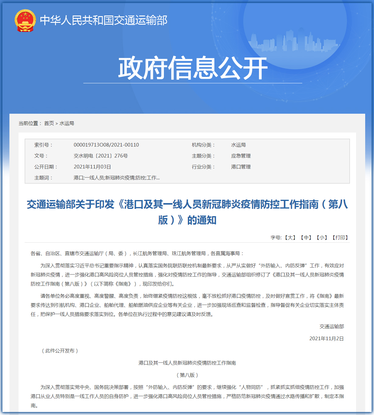 中工网讯 据交通运输部网站消息,近日,为深入贯彻落实习近平总书记重要指示精神,认真落实国务院联防联控机制最新要求,从严从实做好“外防输入、内防反弹”工作,有效应对新冠肺炎疫情,进一步强化港口高风险岗位人员管控措施,强化对疫情防控工作的指导,交通运输部组织修订并印发《港口及其一线人员新冠肺炎疫情防控工作指南(第八版)》(以下简称《指南》)。