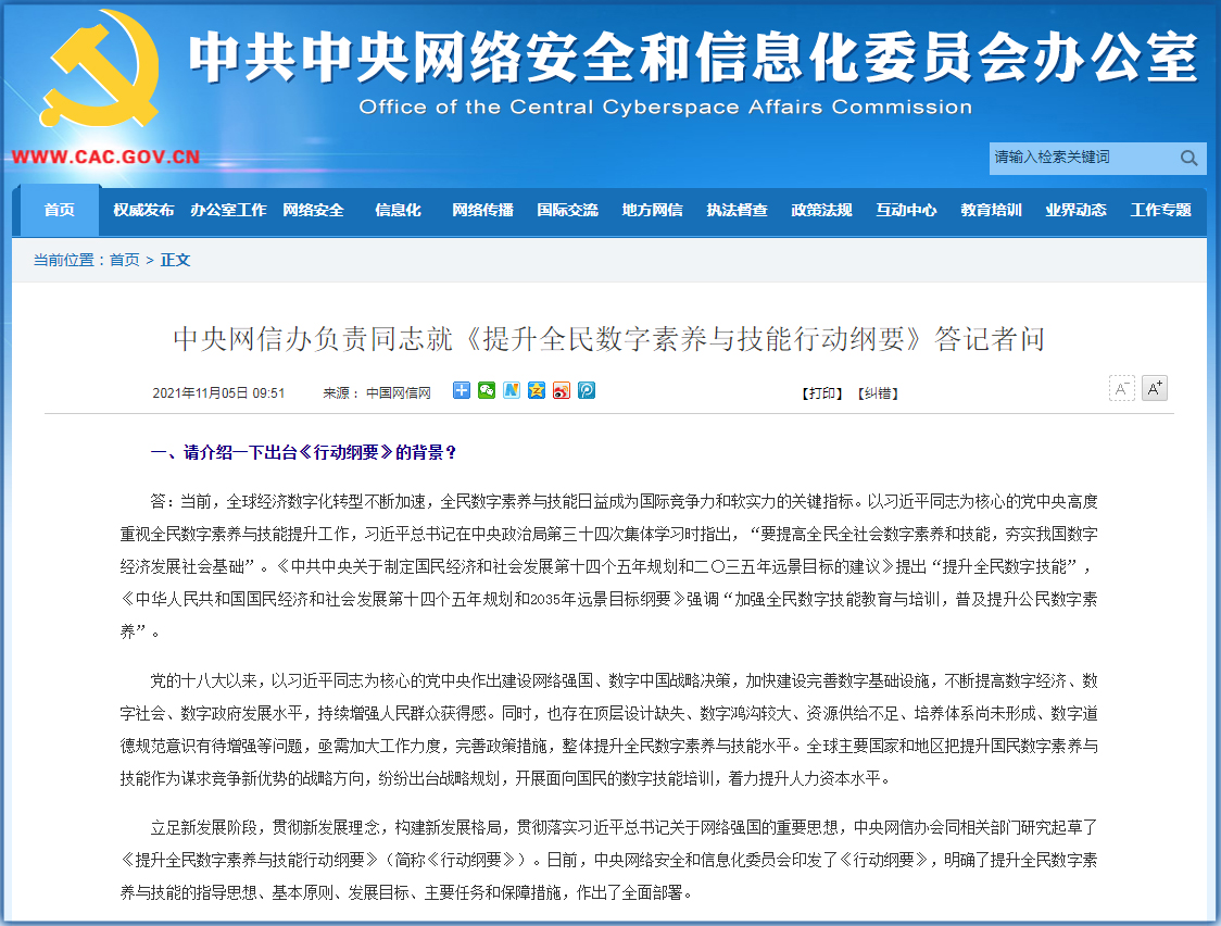 中工网讯 据中央网信办网站消息,近日,中央网信办负责同志就《提升全民数字素养与技能行动纲要》答记者问。