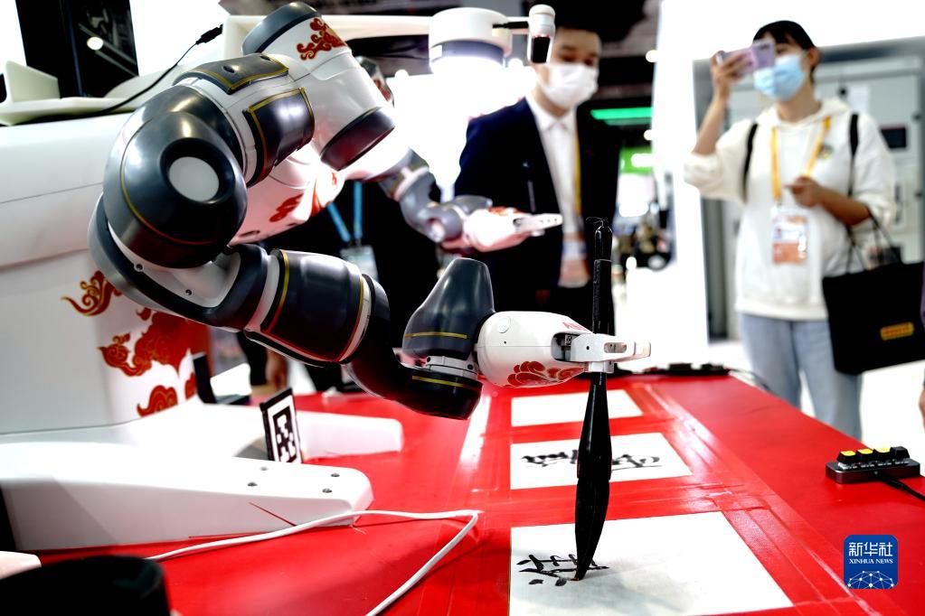 11月5日,在第四届进博会技术装备展区,一台机器人在模仿人写毛笔字。
