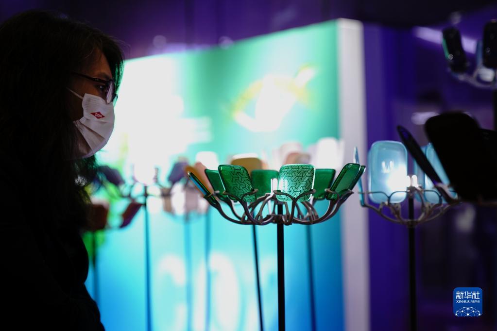 11月5日,参观者在第四届进博会技术装备展区欣赏低碳环保新材料制作的展示品。