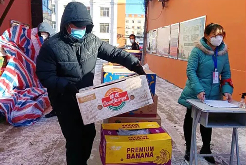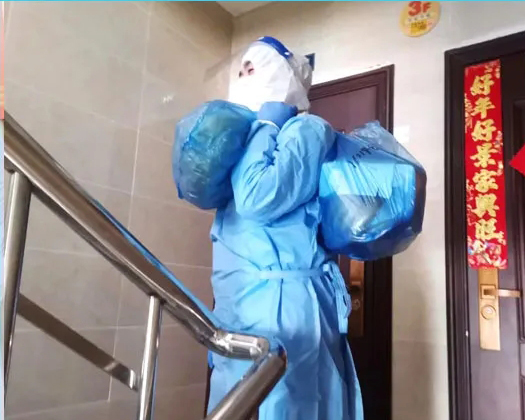 许多小区居民在家隔离不能出门,面对物资缺乏,黑河市总工会的志愿者们主动请缨,走进隔离小区,帮助居民运送物资、扔垃圾,为保证安全性只能走楼梯,一层一层的楼梯,一户一户的穿梭,只为保障隔离居民的正常生活。