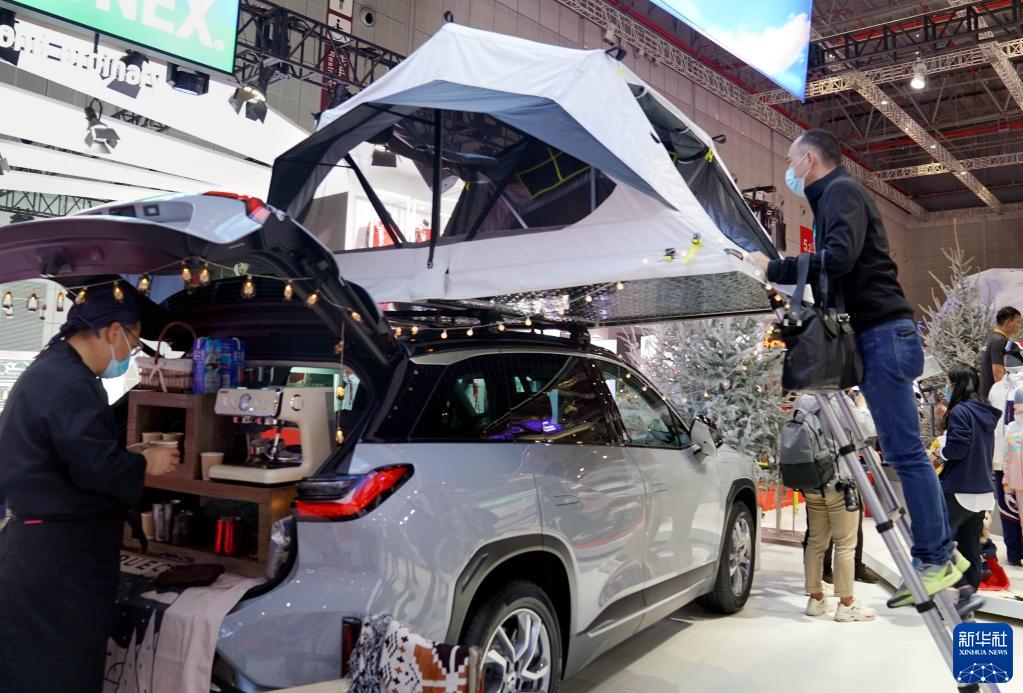 11月6日,参观者在进博会展馆里参观车顶帐篷。