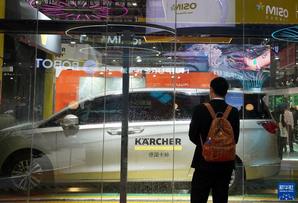 11月6日,观众在德国卡赫展台参观全自动洗车机器人的演示。