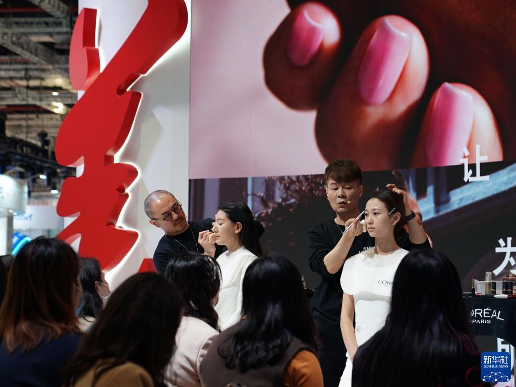 11月6日,在消费品展区的美妆及日化用品专区,化妆师在演示美妆新品的使用和效果。